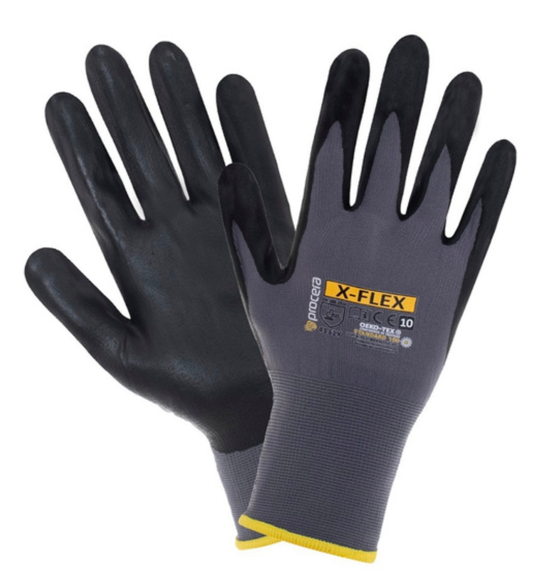 Hansker laget av nylon og polyester med tillegg av Lycra, belagt i håndflaten med skummet nitril. Perfekt passform, fleksibilitet og følelse av gjenstander samtidig som den sikrer høy mekanisk styrke. Perfekt for manuelt arbeid. Økt motstand mot oljer og fett. De har utmerkede pustende egenskaper og "OEKO-TEX" Standard 100-sertifikatet bekrefter mangelen på skadelige stoffer, og garanterer dermed høy komfort for bruk.